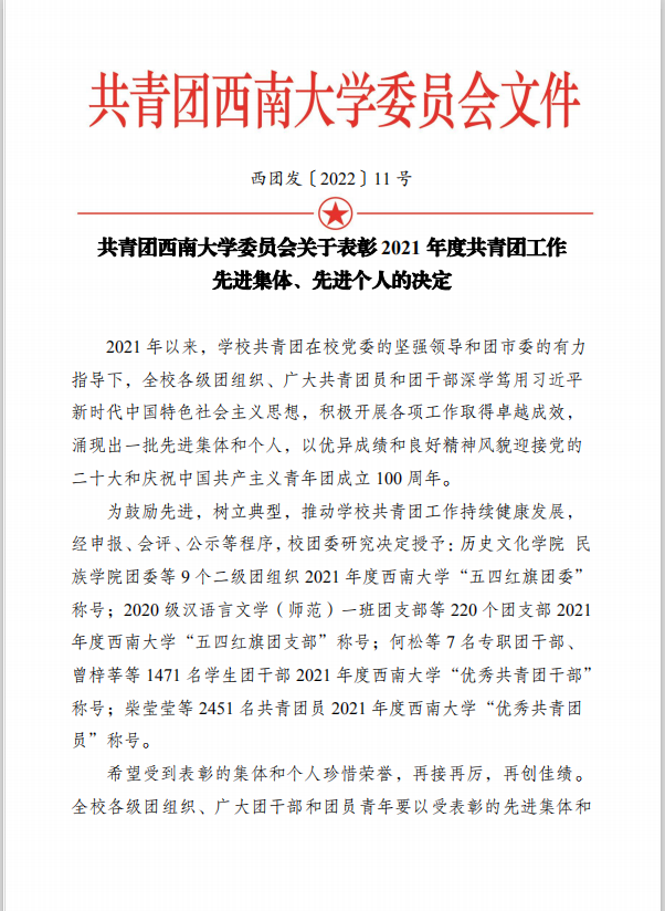 《共青团西南大学委员会关于表彰2021年度共青团工作先进集体、先进个人的决定》于近日发布。公司团委荣获2021年度西南大学“五四红旗团委”称号。