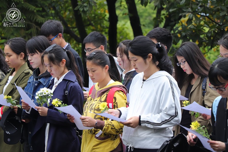 此时,先生的墓碑前已满是雏菊,在史实宣讲团张媛媛同学的带领下,同学们朗诵悼词。生于危亡,心向自强,作孚先生在动荡年代不甘沉沦,自立自强;崛起长江,争雄列强,他践行着“实业救国”的豪迈理想;宜昌撤退,力挽狂澜,他用实际行动支援抗战,勇作民族栋梁。沉着整齐的声音在陵园响起,每个人都表情坚定,庄严肃穆。先生遗志定将传承;作孚精神定会远扬!