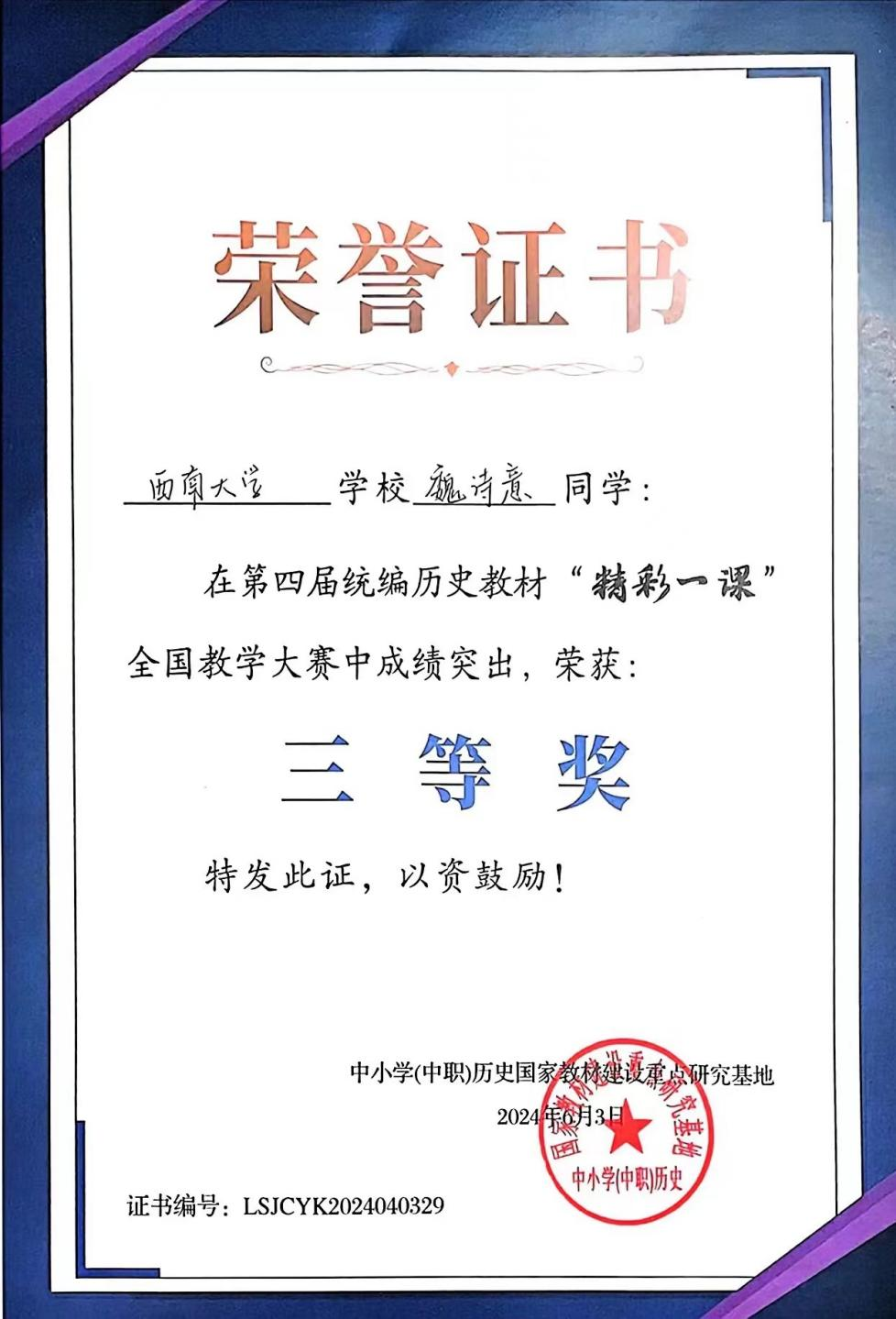 2024年5月30日至6月3日,第四届统编历史教材“精彩一课”全国教学大赛暨义务教育历史教材研究高端论坛在东北师范大学举行。本次大赛由中小学(中职)历史国家教材建设重点研究基地主办,东北师范大学必威西汉姆官网平台承办,共有来自北京师范大学、华东师范大学、西南大学等70余所高校的150名同学参赛。公司2021级师范生王馨乙、魏诗意代表公司参赛。经过激烈角逐,王馨乙同学荣获一等奖、魏诗意同学荣获三等奖,袁从秀老师和谢欧老师荣获“优秀指导教师”称号。