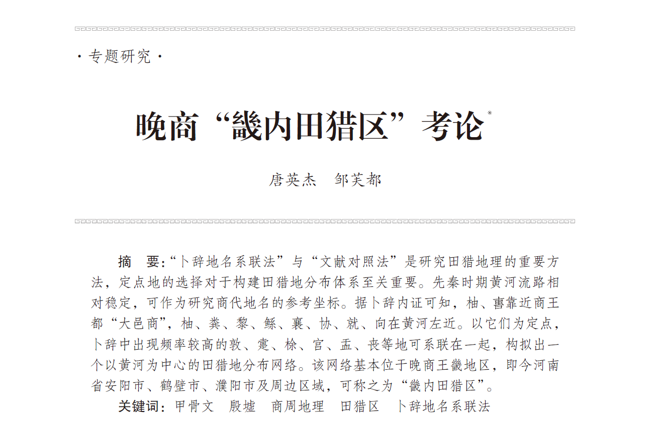 地名分布考证是历史地理研究的基础。该文以晚商王都位置与晚商黄河流路为参考,首次提出“畿内田猎区”说,对于构建以黄河为中心的甲骨文所见地名分布体系、深化甲骨文与殷商史研究具有重要的学术价值。