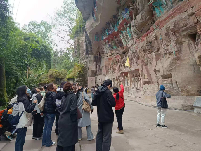 在导游带领下,全体同学分别参观了宝顶山石刻、北山石刻和南山石刻,围绕“理想信念”“责任担当”“修身养性”“敬畏之心”“感恩之心”等篇章开展现场教学与研讨,大家结合石刻寓意,开展家国情怀、文化自信主题交流分享,实地感受世界文化遗产的深刻魅力。