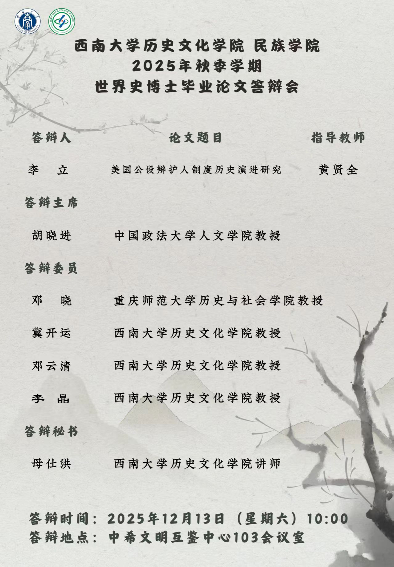 必威西汉姆官网平台 2025年秋季学期世界史博士毕业论文答辩会